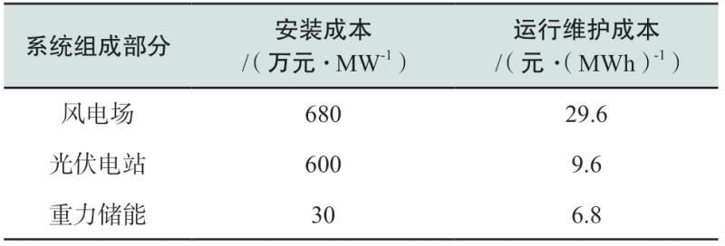 風光儲多能源混合系統(tǒng)中風電場、光伏電站、重力儲能的安裝成本及運行維護成本如附錄A表A1所示[7,16,27],不同發(fā)電方式下各類污染物的環(huán)境價值成本如附錄B表B2所示[28]。另外,電網及系統(tǒng)售電的分時電價如附錄B表B3所示[29]。