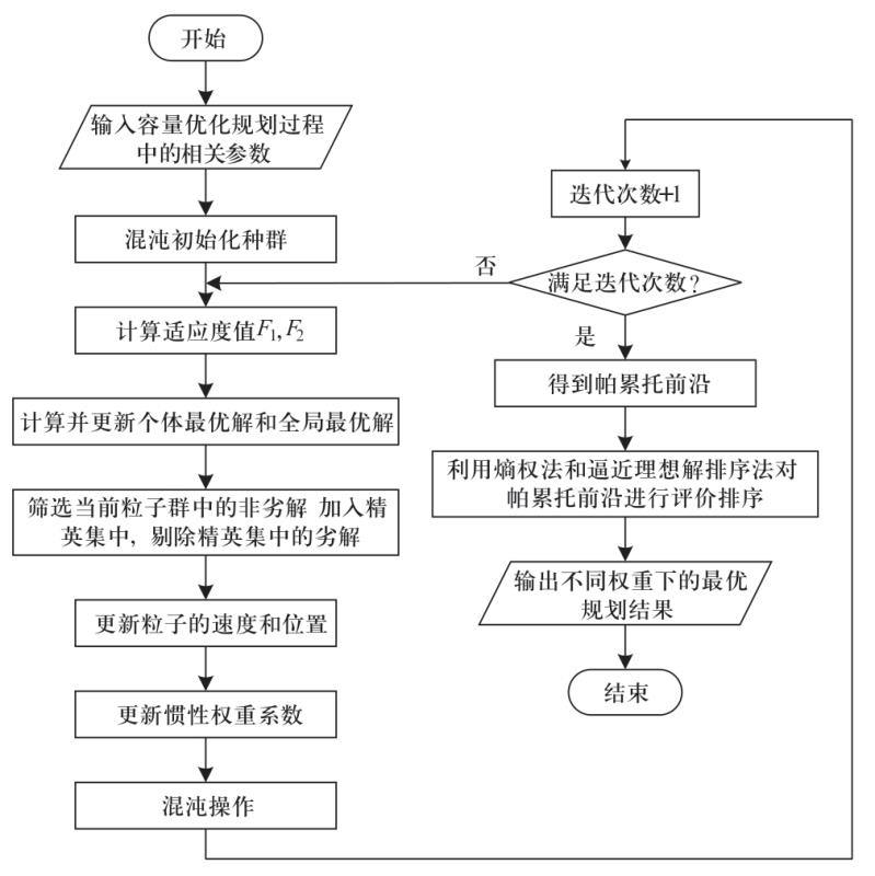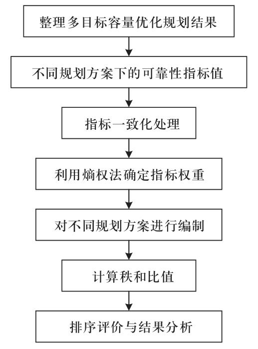 對所建立的多目標容量優(yōu)化規(guī)劃模型利用自適應混沌粒子群算法[21]進行仿真求解,得到一系列非劣解,并由一系列非劣解組成帕累托前沿。在帕累托前沿中,利用熵權法[22]求解不同目標函數的權重,并利用逼近理想解排序法[23]對求得的帕累托前沿進行排序評價,選擇排序評價最優(yōu)的解作為最優(yōu)規(guī)劃方案,具體計算流程如圖2所示?;谇蠼獾玫降娘L光儲多能源混合系統(tǒng)多目標容量優(yōu)化規(guī)劃結果,利用熵權法定權的秩和比評價方法[24]對不同規(guī)劃方案下的可靠性指標進行排序評價,具體評價流程如附錄B圖B1所示。