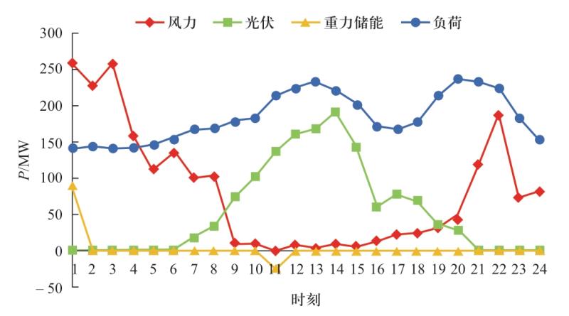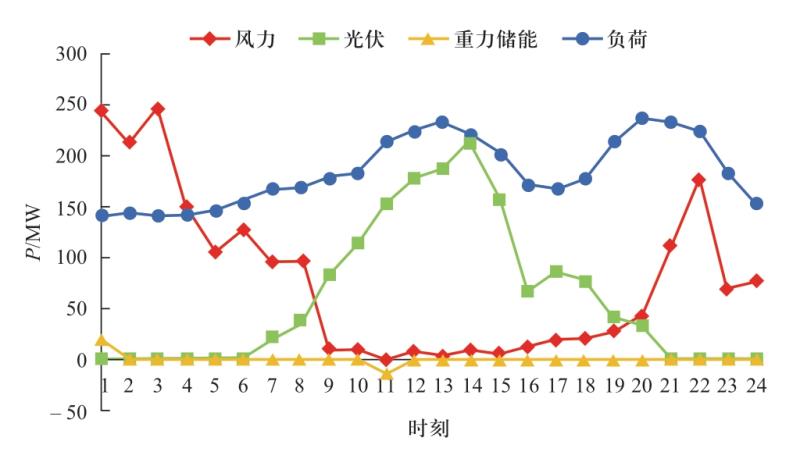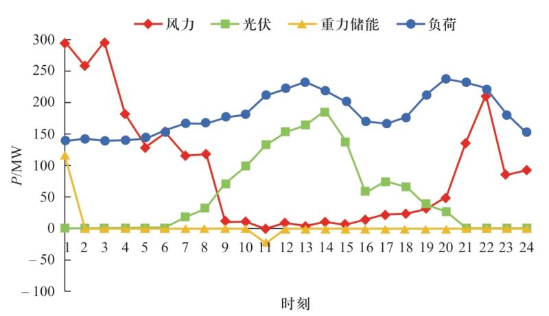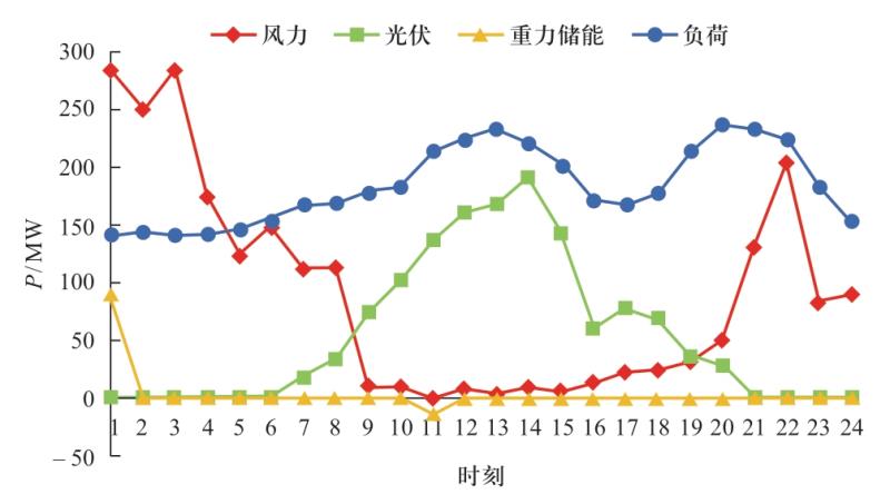 由于不同規(guī)劃方案中的風電場、光伏電站、重力儲能的容量不同,導致每時刻風力、光伏出力不同,重力儲能在配合時進行儲能和放電的電量也不同。由圖6—圖9可以看出,不同規(guī)劃方案的出力曲線趨勢一致,這主要是因為不同規(guī)劃方案規(guī)劃的風電場、光伏電站的容量相差不大,但仍能看出規(guī)劃方案二中每時刻的光伏出力較大,而規(guī)劃方案三中每時刻的風力出力較大。