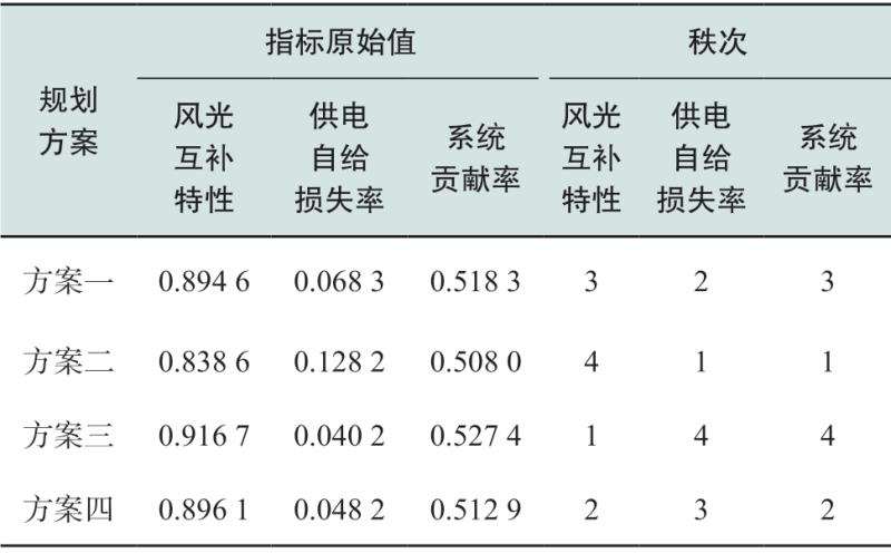 規(guī)劃方案一、規(guī)劃方案二、規(guī)劃方案三、規(guī)劃方案四的加權秩和比值分別為0.687 5、0.573 6、0.671 9、0.569 4,評分排序為1、3、2、4。因此,僅從3種可靠性指標來看,規(guī)劃方案一最優(yōu),其次為規(guī)劃方案三、規(guī)劃方案二,最后為規(guī)劃方案四??傮w來看,規(guī)劃方案一和規(guī)劃方案三中均考慮了系統(tǒng)的可靠性,對綜合指標進行了優(yōu)化,排名在前兩位,而規(guī)劃方案二忽視了系統(tǒng)可靠性,沒有對綜合指標進行優(yōu)化,排名靠后。另外,雖然規(guī)劃方案四排名最后,但與規(guī)劃方案二相比,兩種規(guī)劃方案的加權秩和比值相差不大,規(guī)劃方案四的供電自給損失率及風光儲多能源混合系統(tǒng)貢獻率要優(yōu)于規(guī)劃方案二,同時規(guī)劃方案四的綜合指標較優(yōu),所以,規(guī)劃方案四在一定程度上對具體的可靠性指標進行了優(yōu)化,只是綜合來看規(guī)劃方案二較優(yōu)一些。因此,綜合考慮系統(tǒng)成本及可靠性指標排序評價,規(guī)劃方案一為最優(yōu)規(guī)劃方案,即在規(guī)劃過程中要合理考慮成本及可靠性,既要保證系統(tǒng)的經濟性,也不影響系統(tǒng)的可靠性。
