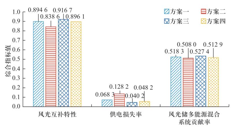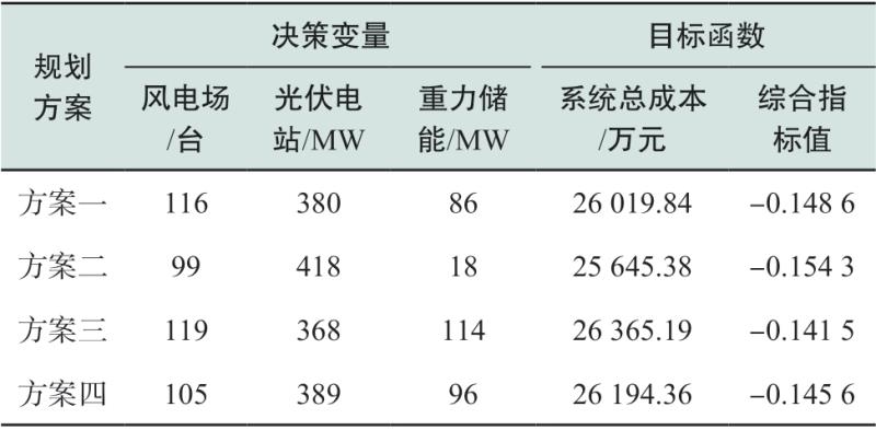 由表2及圖4可知,由于不同規(guī)劃方案下的偏好不同,通過規(guī)劃得到的風電場、光伏電站、重力儲能的容量均不同,從而導致了系統(tǒng)總成本和綜合指標值的變化。對比4種規(guī)劃方案來看,方案二的系統(tǒng)總成本最小,方案三的綜合指標最優(yōu)。另外,規(guī)劃方案一的初始成本為33 716.37萬元,規(guī)劃方案二的初始成本為33 582.87萬元,規(guī)劃方案三的初始成本為34 052.28萬元,規(guī)劃方案四的初始成本為33 017.28萬元,由于規(guī)劃方案三配置的風電場容量、儲能容量最大,而風電場的安裝成本又比較高,所以導致規(guī)劃方案三的初始成本較高。此外,規(guī)劃方案三配置了相比其他幾種方案較大容量的儲能,主要是為了保證系統(tǒng)的供電可靠性及系統(tǒng)的貢獻率,而規(guī)劃方案二為追求系統(tǒng)總成本最小,配置的儲能容量最小,同時配置的風電場容量也最小。