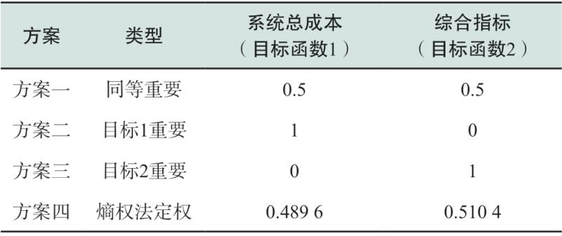 規(guī)劃方案一雖然在4種方案中的兩目標均不屬于最優(yōu),但其兼顧了系統(tǒng)的成本及可靠性,有效降低了系統(tǒng)總成本,提高了系統(tǒng)的可靠性。相比而言,規(guī)劃方案二認為系統(tǒng)的總成本重要,忽視了系統(tǒng)的可靠性,得到的系統(tǒng)總成本是最小的,但綜合指標值卻是幾種規(guī)劃方案中最小的。同樣地,規(guī)劃方案三認為系統(tǒng)的可靠性重要,忽視了系統(tǒng)的總成本,得到的綜合指標值是最優(yōu)的,但系統(tǒng)總成本卻是最大的。規(guī)劃方案四同樣既考慮系統(tǒng)總成本,又考慮了系統(tǒng)可靠性,在損失一定成本的同時有效優(yōu)化了綜合指標。
