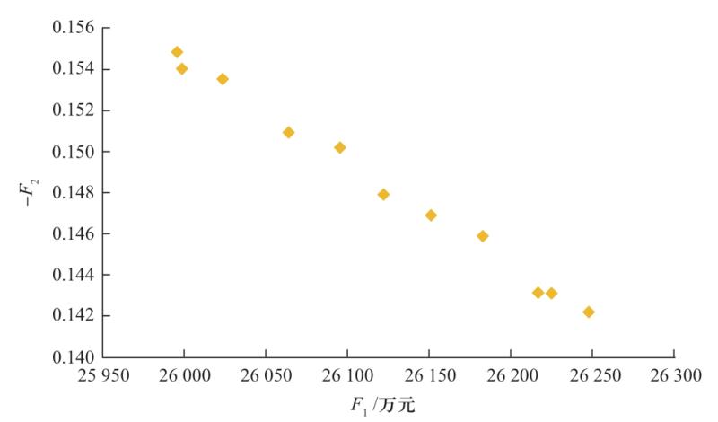本文借助MATLAB軟件,利用多目標自適應混沌粒子群算法求解建立的多目標容量優(yōu)化規(guī)劃模型,得到多目標帕累托前沿,如圖3所示。其中,橫坐標F1表示系統(tǒng)總成本,縱坐標-F2表示綜合指標的相反數,帕累托前沿中的每個點都表示一個規(guī)劃方案,共有11個可行的規(guī)劃方案。由圖3可知,系統(tǒng)總成本及綜合指標均在比較小的范圍內變化,滿足系統(tǒng)總成本越小,綜合指標的相反數越大,即系統(tǒng)總成本的降低,對綜合指標有著負面的影響。類似的,如果綜合指標更優(yōu),系統(tǒng)總成本將會增大,兩個目標之間存在一定的制約關系。