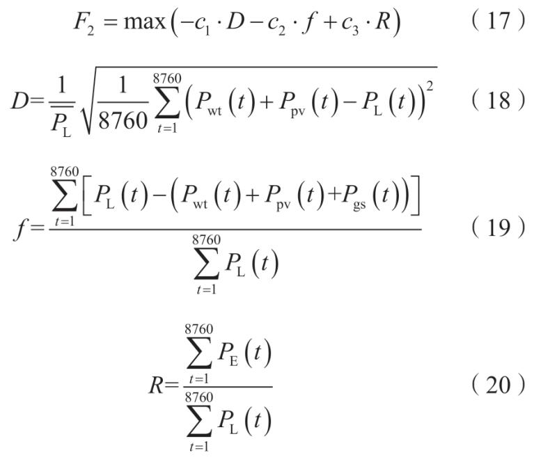 2)目標函數2:綜合指標(F2)最優(yōu),包括風光互補特性、供電自給損失率及風光儲多能源混合系統(tǒng)貢獻率等可靠性指標。