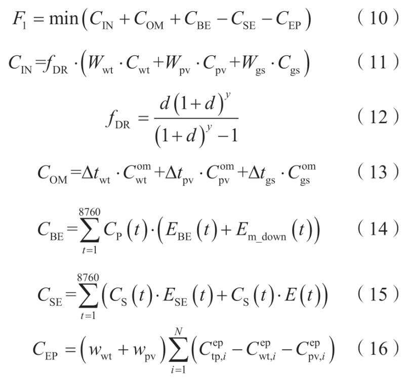 1)目標函數1:系統(tǒng)總成本(F1)最小,包括系統(tǒng)初始成本、運行維護成本、購電成本、售電收益及環(huán)保收益等。