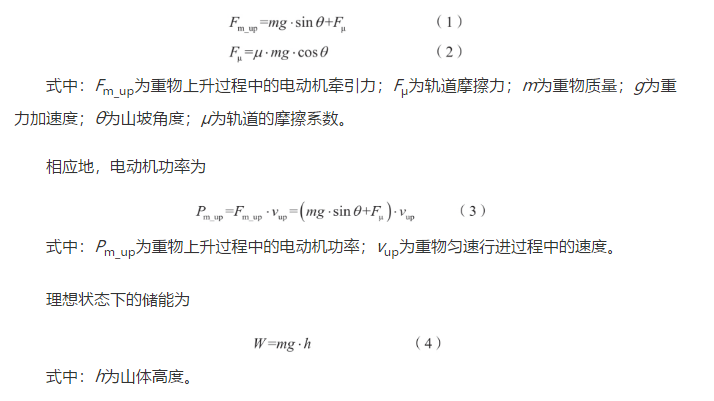 本文假設在建模過程中只有一條軌道,即只研究一套重力儲能裝置,只考慮山體高度、坡度、重物質量等對重力儲能存儲和釋放能量多少的影響。其中,在存儲能量時,電動機工作,消耗電能,利用滑輪組將重物從山底軌道處拉至山頂,過程中重力勢能增加,最終在山頂存儲起來。電動機將重物從山底拉上山頂過程中保持勻速,此時重物受力包括摩擦力、電動機牽引力、自身重力等,具體的重物受力平衡可用式(1)—(2)表示。