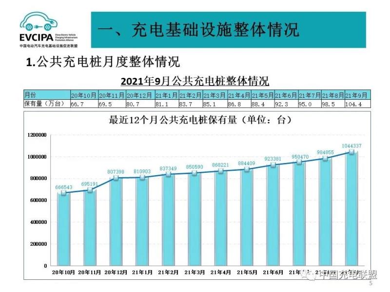 1、公共充電基礎(chǔ)設(shè)施運行情況,2021年9月比2021年8月公共充電樁增加5.95萬臺,9月同比增長72.3%。截至2021年9月,聯(lián)盟內(nèi)成員單位總計上報公共類充電樁104.4萬臺,其中直流充電樁42.8萬臺、交流充電樁61.6萬臺、交直流一體充電樁414臺。從2020年10月到2021年9月,月均新增公共類充電樁約3.65萬臺。