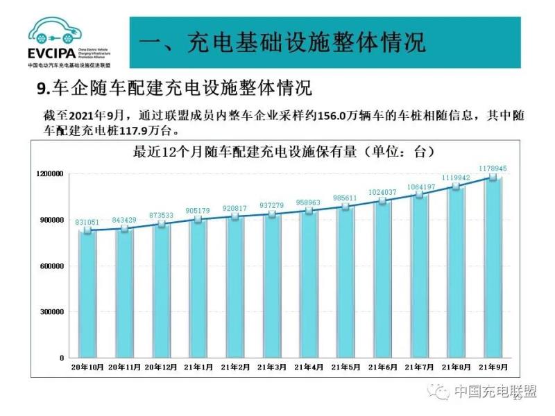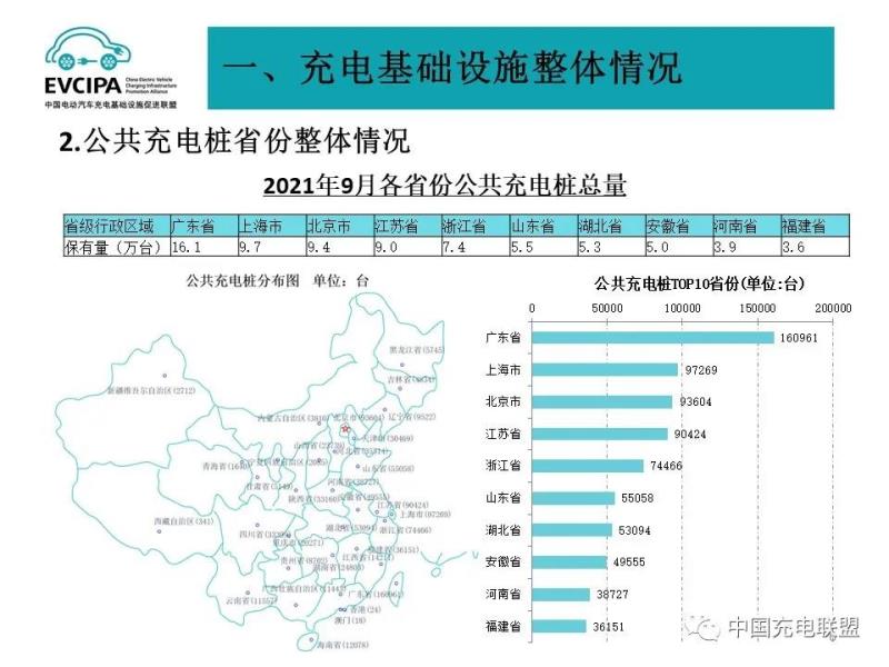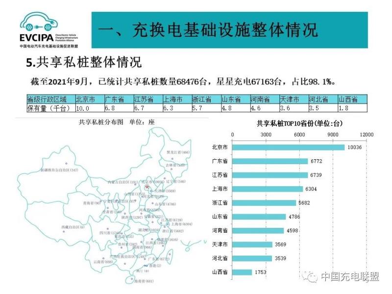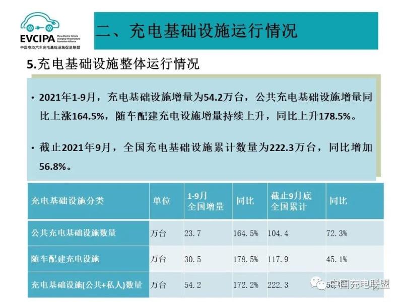 5、充電基礎(chǔ)設(shè)施整體運行情況,2021年1-9月,充電基礎(chǔ)設(shè)施增量為54.2萬臺,公共充電基礎(chǔ)設(shè)施增量同比上漲164.5%,隨車配建充電設(shè)施增量持續(xù)上升,同比上升178.5%。截止2021年9月,全國充電基礎(chǔ)設(shè)施累計數(shù)量為222.3萬臺,同比增加56.8%。