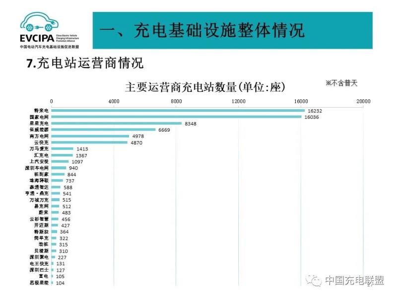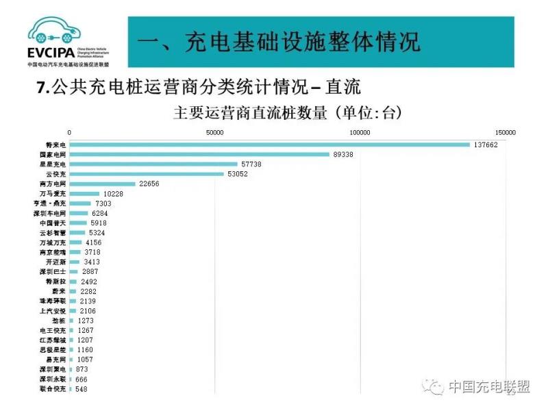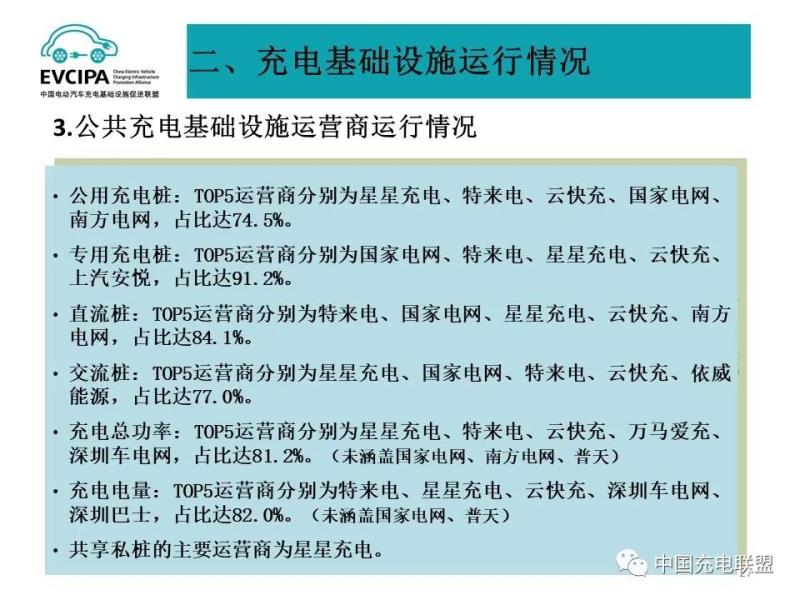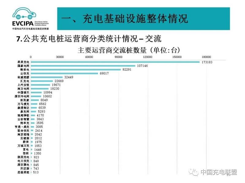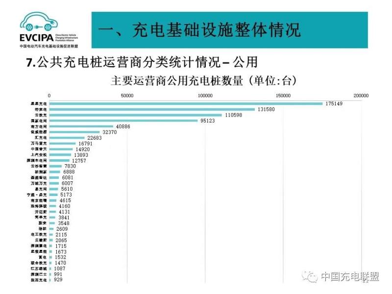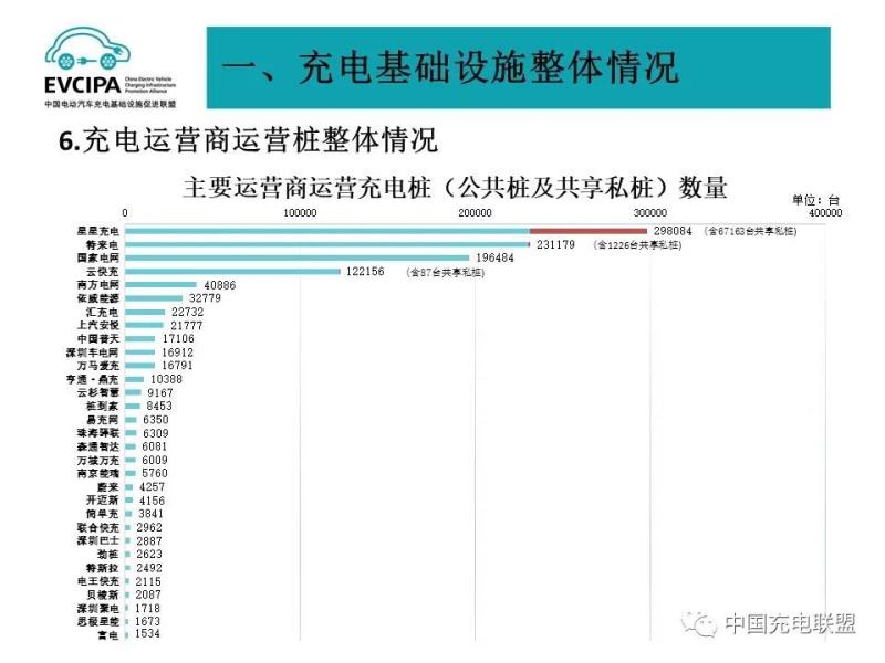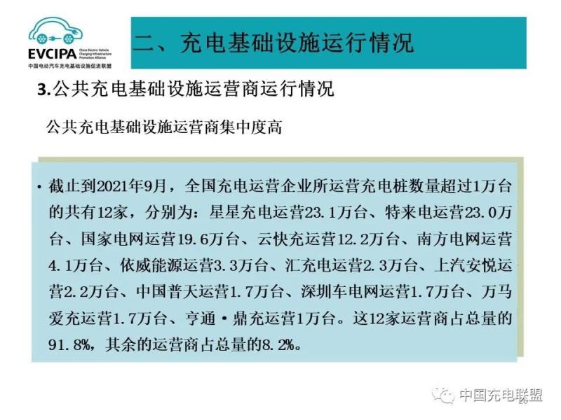 3、公共充電基礎(chǔ)設(shè)施運營商運行情況,截止到2021年9月,全國充電運營企業(yè)所運營充電樁數(shù)量超過1萬臺的共有12家,分別為:星星充電運營23.1萬臺、特來電運營23.0萬臺、國家電網(wǎng)運營19.6萬臺、云快充運營12.2萬臺、南方電網(wǎng)運營4.1萬臺、依威能源運營3.3萬臺、匯充電運營2.3萬臺、上汽安悅運營2.2萬臺、中國普天運營1.7萬臺、深圳車電網(wǎng)運營1.7萬臺、萬馬愛充運營1.7萬臺、亨通·鼎充運營1萬臺。這12家運營商占總量的91.8%,其余的運營商占總量的8.2%。