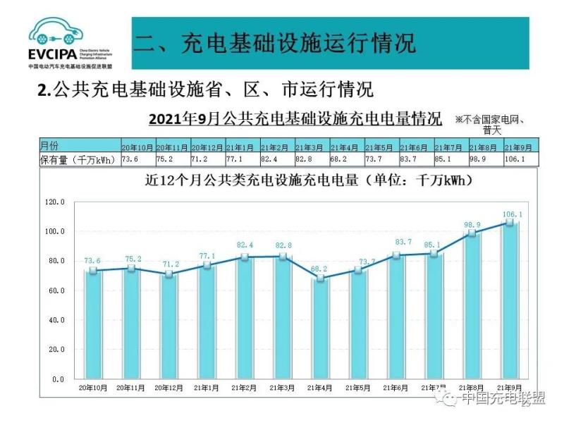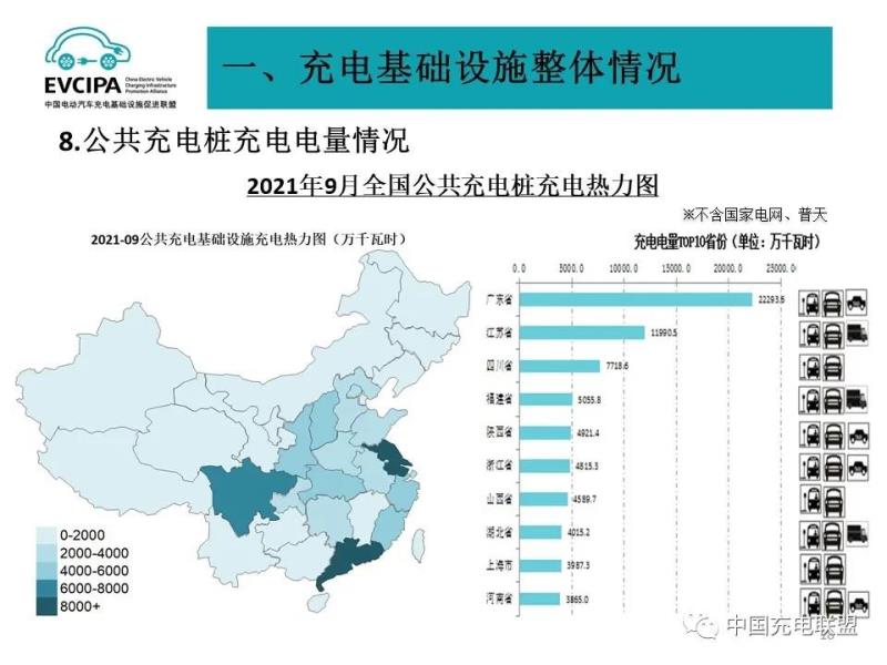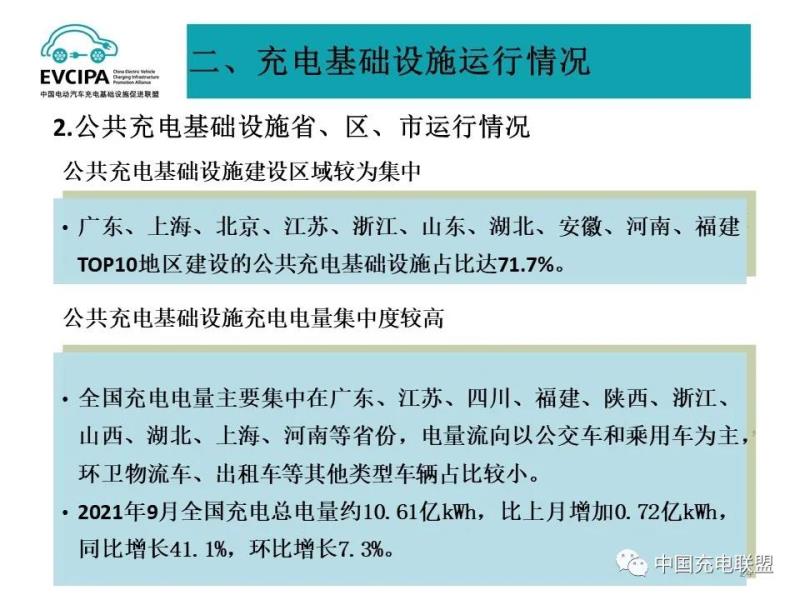 2、公共充電基礎(chǔ)設(shè)施省、區(qū)、市運行情況,廣東、上海、北京、江蘇、浙江、山東、湖北、安徽、河南、福建TOP10地區(qū)建設(shè)的公共充電基礎(chǔ)設(shè)施占比達71.7%。全國充電電量主要集中在廣東、江蘇、四川、福建、陜西、浙江、山西、湖北、上海、河南等省份,電量流向以公交車和乘用車為主,環(huán)衛(wèi)物流車、出租車等其他類型車輛占比較小。2021年9月全國充電總電量約10.61億kWh,比上月增加0.72億kWh,同比增長41.1%,環(huán)比增長7.3%。