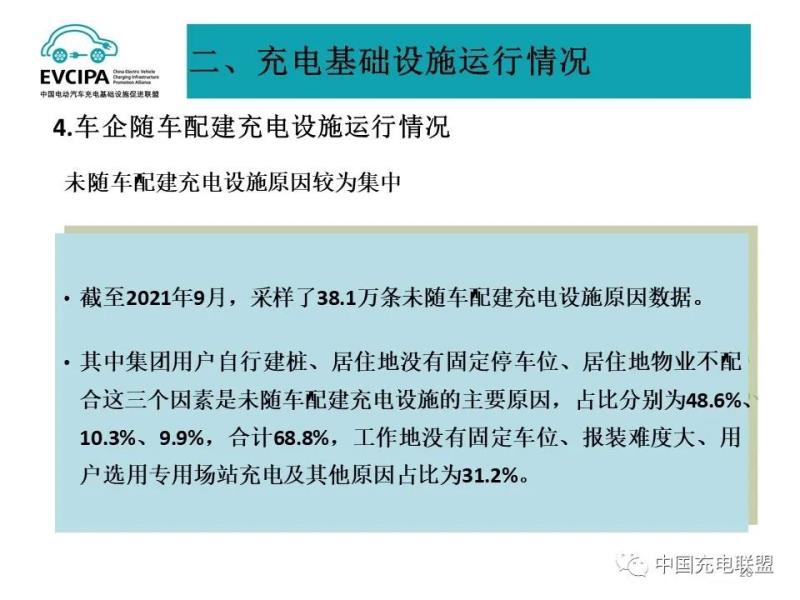 4、車企隨車配建充電設(shè)施運行情況,截至2021年9月,采樣了38.1萬條未隨車配建充電設(shè)施原因數(shù)據(jù)。其中集團用戶自行建樁、居住地沒有固定停車位、居住地物業(yè)不配合這三個因素是未隨車配建充電設(shè)施的主要原因,占比分別為48.6%、10.3%、9.9%,合計68.8%,工作地沒有固定車位、報裝難度大、用戶選用專用場站充電及其他原因占比為31.2%。