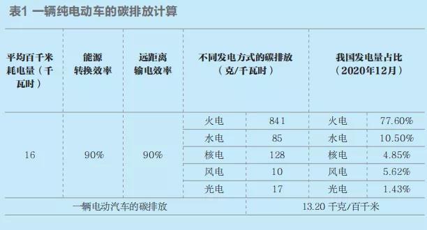 早在2010年,清華大學的一個研究團隊曾指出,在當前中國的能源結構下,電動汽車造成的碳排放,與燃油汽車相比差別不大;但是在二氧化硫和碳化物方面的排放,要數倍于燃油汽車。燃油汽車目前每百千米的碳排放量為19.9千克。而根據2020年中國發(fā)電能源結構和電動汽車的主流性能計算,得到的數據:純電動乘用車每百千米的碳排放量為13.2千克。(計算過程中涉及的各種參數見表1)