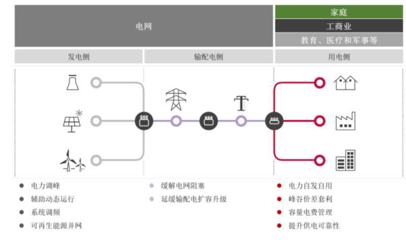 基于多變的應用途徑,實際上電化學儲能已經(jīng)突破了單純的存儲功能,而是應用于整個用電體系的各個環(huán)節(jié)。