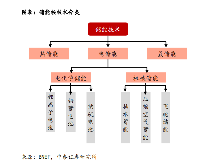 按照儲能方式的不同,儲能可以劃分為熱儲能、電儲能和氫儲能三大類。其中,電儲能最為成熟,抽水蓄能、壓縮空氣儲能、電化學儲能、飛輪蓄能等均屬于電儲能。