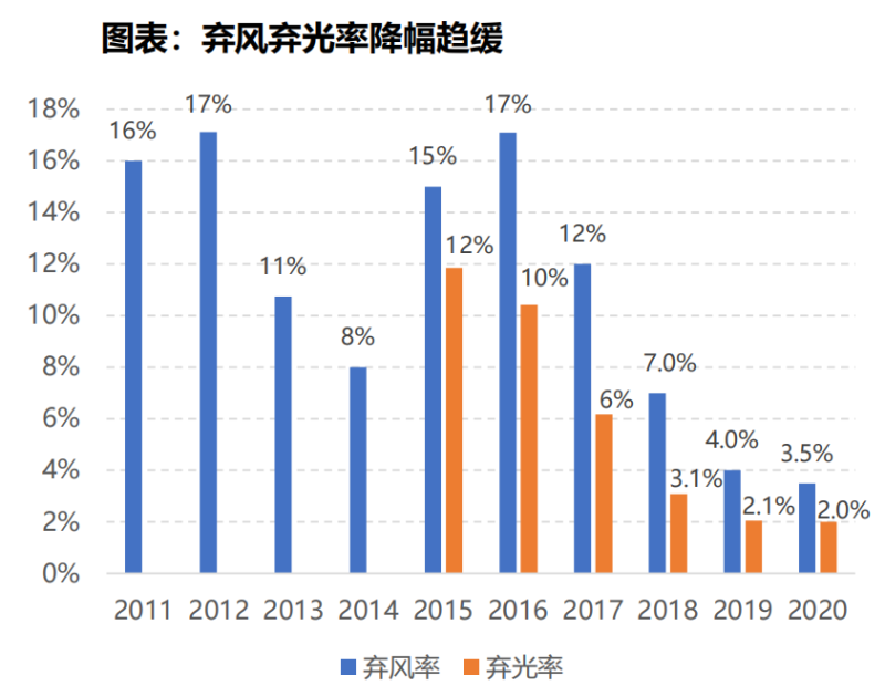 在波峰的時候,光伏、風電等新能源可以轉化成大量的電能,然而由于這部分電能難以儲存,并網(wǎng)又是瞬時的,整體消納有限,因此造成很多的棄電現(xiàn)象,2020年全國棄光率為2.0%、棄風率為3.5%;在波谷的時候,新能源又因為自然因素而發(fā)電不足,從而產生能量缺口。