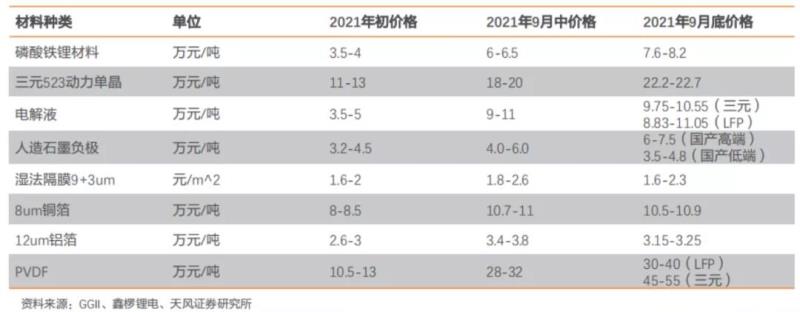 2021年以來,因下游景氣高漲,動力電池原材料供不應(yīng)求,四大主材、鎳/鈷/鋰/銅/鋁、氫氧化鋰、碳酸鋰、六氟磷酸鋰、PVDF、VC等價(jià)格集中上揚(yáng),部分輔材較年初上漲數(shù)倍,甚至“一貨難求”。