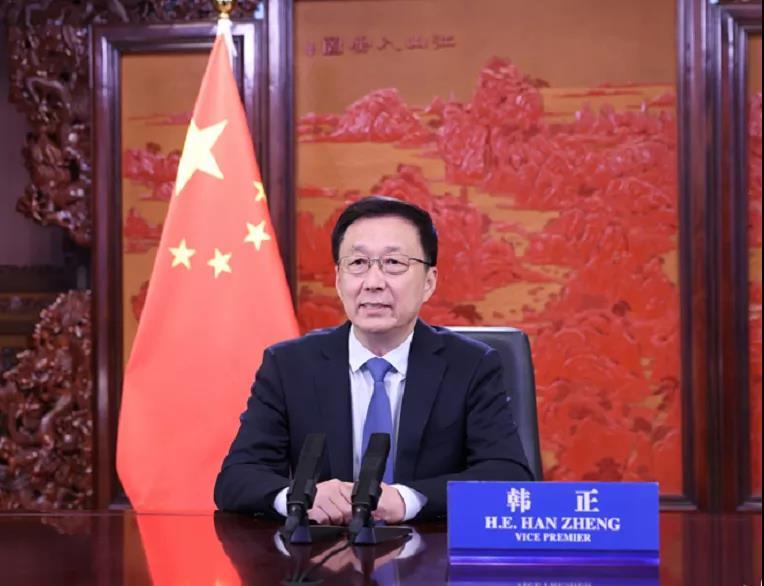 中共中央政治局常委、國務院副總理韓正在北京以視頻方式出席“2021俄羅斯能源周”國際論壇并發(fā)表致辭。新華社記者 王曄 攝