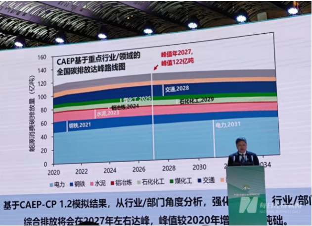 王金南表示,根據(jù)CAEP-CP 1.2(CAEP是中國工程物理研究院的縮寫)模擬結(jié)果,從行業(yè)/部門角度分析,行業(yè)/部門綜合排放將會(huì)在2027年左右達(dá)峰,彼時(shí)全國碳排放峰值將達(dá)到122億噸。