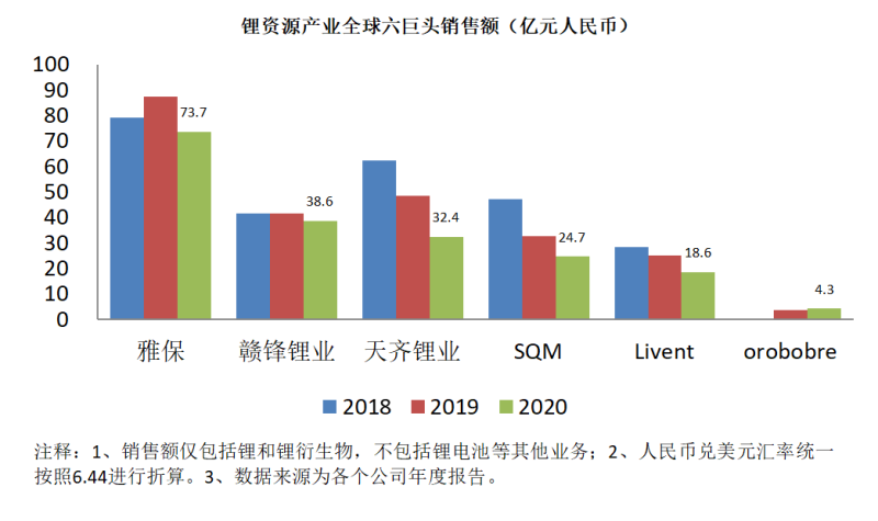 據(jù)相關(guān)上市公司披露數(shù)據(jù),全球前六大鋰資源公司分別為雅保、贛鋒鋰業(yè)、天齊鋰業(yè)、SQM、Livent和orobore。這六家公司2020年度分別在鋰礦及鋰衍生物領(lǐng)域銷售額達到73.7億元、38.6億元、32.4億元、24.7億元、18.6億元和4.3億元(人民幣,人民幣兌美元匯率以6.44進行折算)。