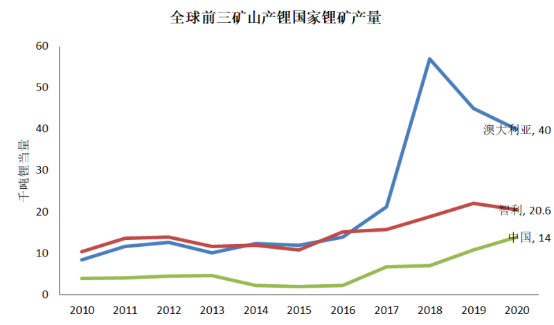 事實上,從全球范圍來看,我國的鋰資源并不突出。據(jù)BP能源統(tǒng)計,2020年全球礦山產(chǎn)鋰的第一大國為澳大利亞,2020年產(chǎn)量為40千噸鋰當量,其次為智利,2020年產(chǎn)量為20.6千噸鋰當量,中國位列第三位,為14千噸鋰當量。