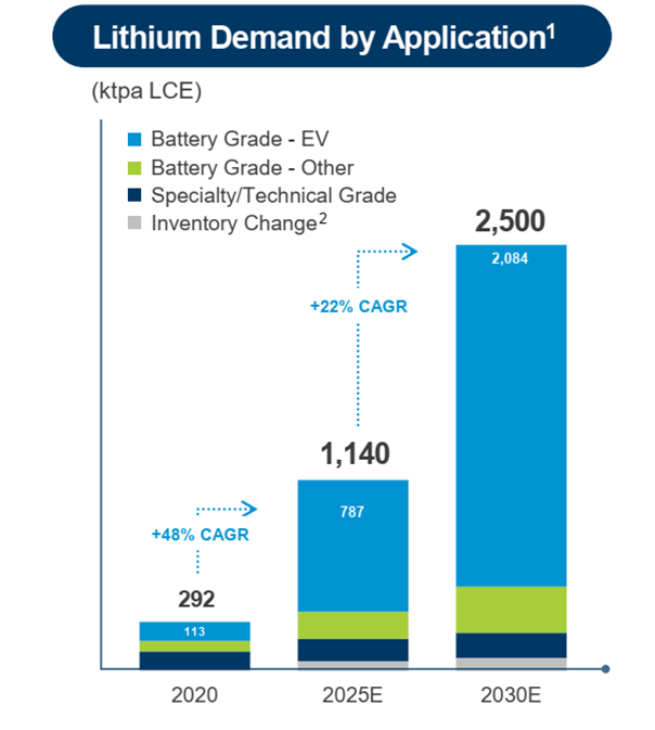 而從長遠的需求出發(fā),雅保公司預測至2030年,全球?qū)︿嚨男枨髮⑦_到2500千噸碳酸鋰當量/年。2020年至2025年的復合增長率為48%,2026年至2030年的復合增長率為22%。