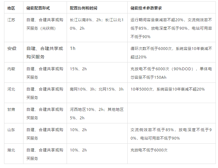 今年以來,各地關(guān)于風(fēng)電、光伏發(fā)電開發(fā)建設(shè)項(xiàng)目配置儲能的方式進(jìn)行了差異化和細(xì)致化的規(guī)定,編者對部分地區(qū)配置儲能相關(guān)文件的梳理,詳見下表。
