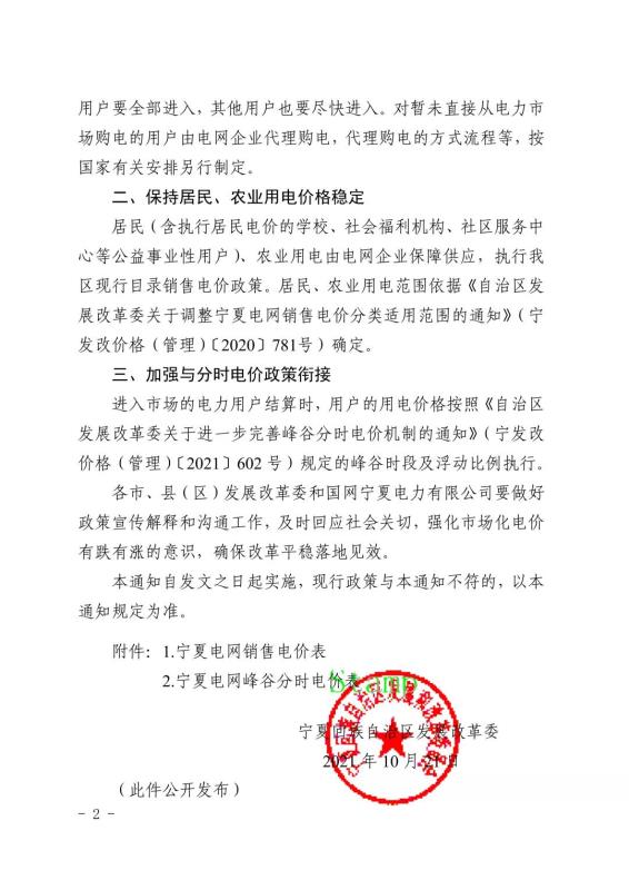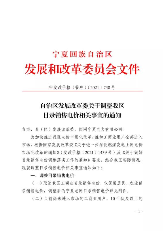 寧夏:關(guān)于調(diào)整我區(qū)目錄銷售電價(jià)相關(guān)事宜的通知