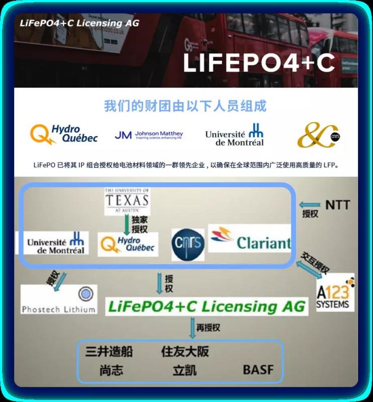 經(jīng)過包碳之后,具有較好的導電性能,讓磷酸鐵鋰電池從實驗室走向市場。德州大學隨后將磷酸鐵鋰專利獨家授權(quán)給加拿大魁北克公共事業(yè)水力公司(Hydro-Quebec,H-Q),H-Q又將磷酸鐵鋰的獨家商業(yè)授權(quán)給其轉(zhuǎn)投資子公司Phostech Lithium公司。HQ主要具備這兩個磷酸鐵鋰的基礎專利。