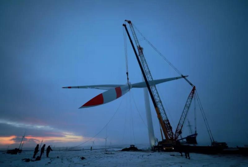 2020年11月27日,國(guó)網(wǎng)冀北電力施工人員在 國(guó)家風(fēng)光儲(chǔ)輸示范工程(二期)4.5兆瓦風(fēng)機(jī) 吊裝現(xiàn)場(chǎng)開展施工作業(yè)。攝影 / 李崢