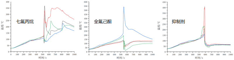 2、FKF-M-165N抑制劑噴放后具有獨特的降溫效果,能夠快速降低熱失控鋰電池溫度,持續(xù)抑制溫度提升,防止熱失控蔓延;