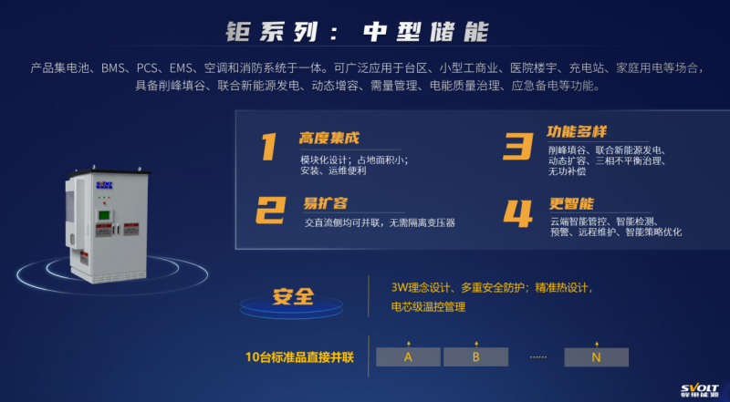 產(chǎn)品集電池、BMS、PCS、EMS、空調(diào)和消防系統(tǒng)于一體??蓮V泛應(yīng)用于臺區(qū)、小型工商業(yè)、醫(yī)院樓宇、充電站、家庭用電等場合,具備削峰填谷、聯(lián)合新能源發(fā)電、動態(tài)增容、需量管理、電能質(zhì)量治理、應(yīng)急備電等功能。