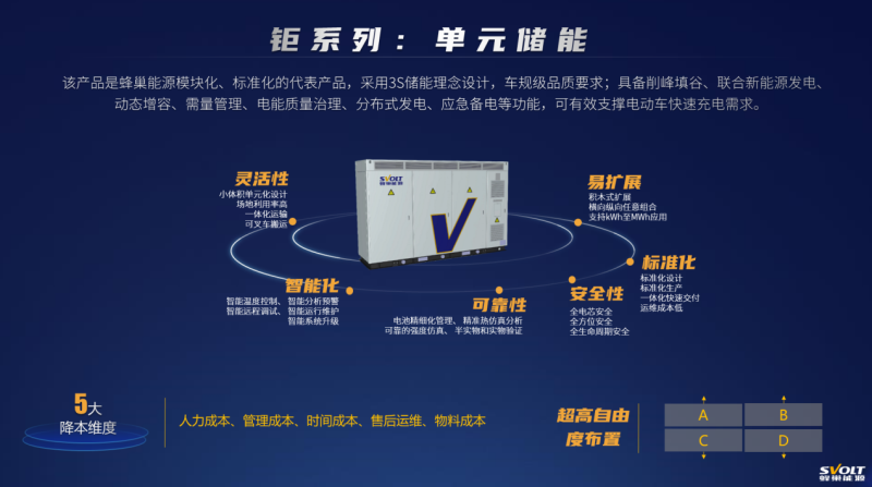 該產(chǎn)品是蜂巢能源模塊化、標(biāo)準(zhǔn)化的代表產(chǎn)品,采用3S儲能理念設(shè)計(jì),車規(guī)級品質(zhì)要求;具備削峰填谷、聯(lián)合新能源發(fā)電、動態(tài)增容、需量管理、電能質(zhì)量治理、分布式發(fā)電、應(yīng)急備電等功能,可有效支撐電動車快速充電需求。