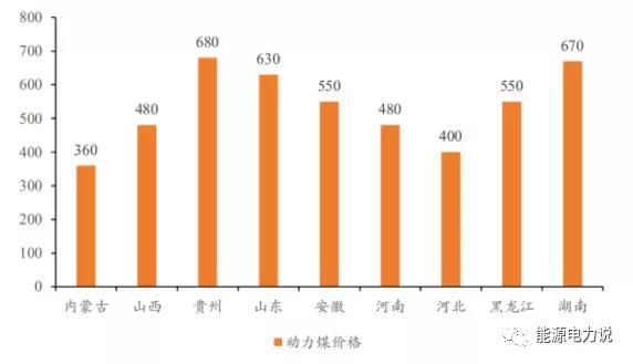 由于不同種類(lèi)的煤價(jià)格有別,在這里我們主要考察各省份動(dòng)力煤的價(jià)格,可以發(fā)現(xiàn)在煤炭?jī)?chǔ)量和產(chǎn)量較多的地區(qū)比如內(nèi)蒙古、山西等省份,相同種類(lèi)煤炭的價(jià)格也相對(duì)其他省份較低。根據(jù)中國(guó)煤炭市場(chǎng)網(wǎng)發(fā)布的截至到 2019 年 1 月的數(shù)據(jù),全國(guó)部分省份動(dòng)力煤價(jià)格如下,其中需要重點(diǎn)關(guān)注的是內(nèi)蒙古動(dòng)力煤價(jià)格僅為 360 元/噸,而混煤的價(jià)格是 170 元/噸。