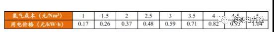 測(cè)算據(jù)測(cè)算,水電解制氫設(shè)備、安裝、土建及其他總投資 1410 萬(wàn)元,每年用電等費(fèi)用為 2700 萬(wàn)元,每年成本合計(jì) 2954 萬(wàn)元,對(duì)應(yīng)氫氣成本 3.69 元/Nm3。現(xiàn)分別計(jì)算不同制氫成本情況下,對(duì)應(yīng)的用電價(jià)格,如下表所示。