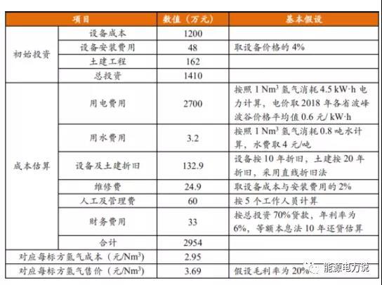 為測(cè)算電解水制氫的成本,假定制氫規(guī)模 1000 Nm3/h,年產(chǎn)氫 100 萬(wàn) Nm3。測(cè)算過(guò)程及假設(shè)如下表: