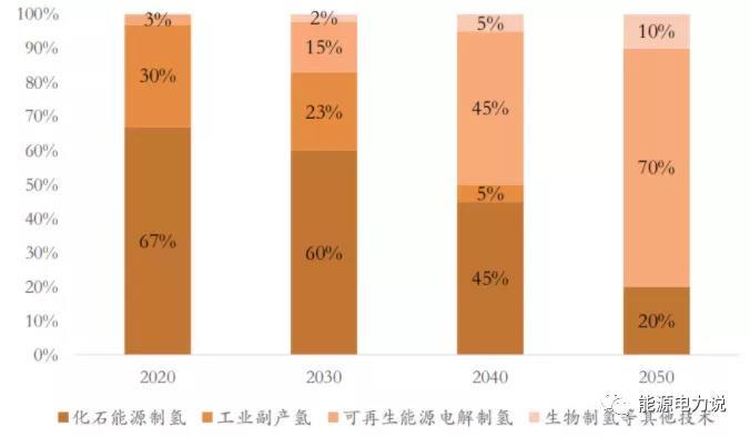 可再生能源電解水制氫將上升為未來(lái)供氫主體。在氫能市場(chǎng)發(fā)展初期(2020-2025 年),化石燃料制氫與工業(yè)副產(chǎn)物制氫憑借較低的成本占據(jù)制氫結(jié)構(gòu)的主體地位,隨著化石燃料產(chǎn)量下降,這兩種方式占比逐漸下降;