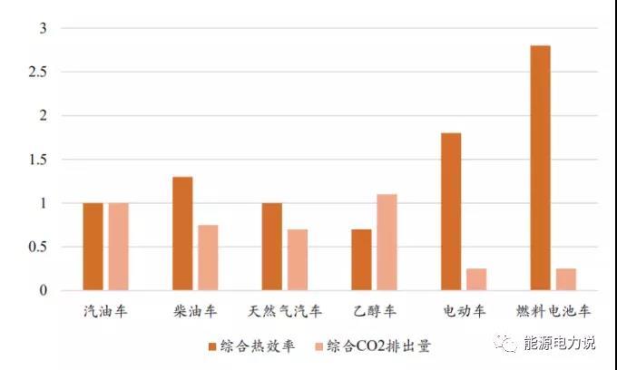 以汽油內(nèi)燃機(jī)的綜合熱效率和CO2排放量為基準(zhǔn)來(lái)對(duì)比。氫燃料電池的綜合熱效率最高,同時(shí) CO2排放量少,是替代石油供給車(chē)輛動(dòng)力的最佳燃料。