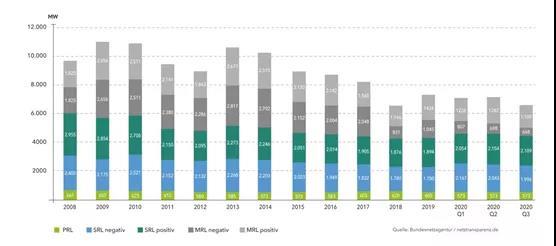 圖一:德國輸電公司平衡功率的招標(biāo)情況,其中PRL為一次調(diào)頻功率,SRL為二次調(diào)頻功率,MRL為三次調(diào)頻功率