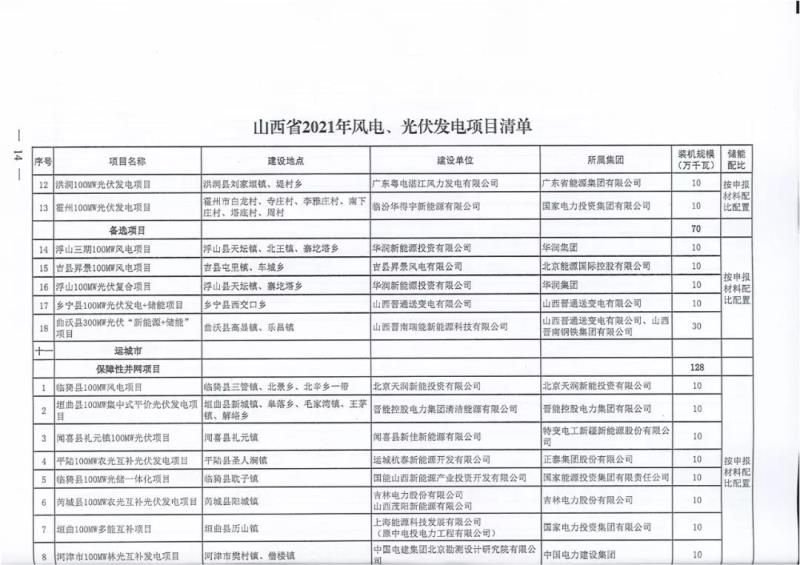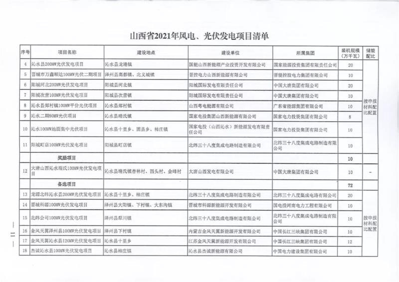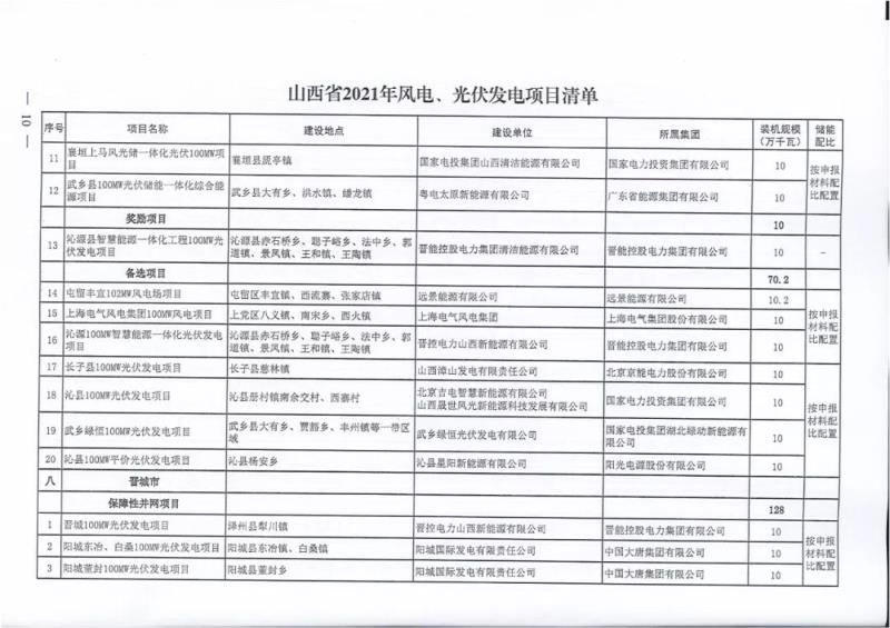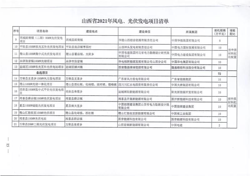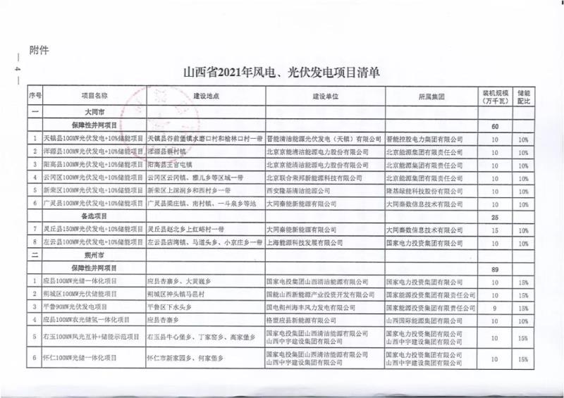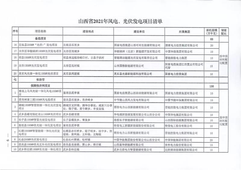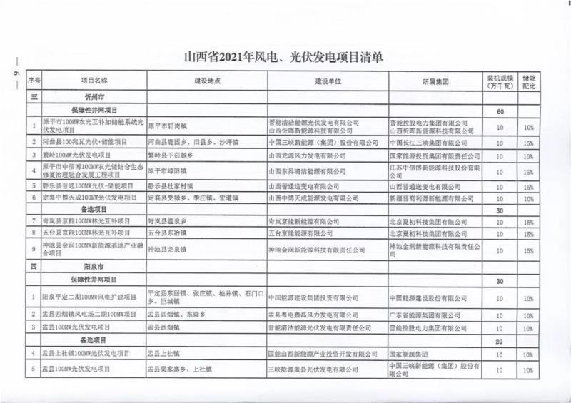 中國儲能網(wǎng)訊:10月22日,山西正式2021年度風(fēng)電、光伏發(fā)電保障性并網(wǎng)年度建設(shè)計劃。風(fēng)、光合計17.792GW,其中保障性11.2GW+獎勵700MW+備選5.892GW(山西下發(fā)9.71GW光伏保障項目(另備選4.95GW),配10%-15%儲能,文件明確保障性規(guī)模與獎勵規(guī)??赏介_展前期工作,優(yōu)先保證保障性并網(wǎng)項目和獎勵項目并網(wǎng),如上述項目未能按承諾時間并網(wǎng),將視項目成熟度、建設(shè)進度和接入條件等,從備選項目中選擇并網(wǎng)項目,保障完成國家下達的最低消納責(zé)任權(quán)重。