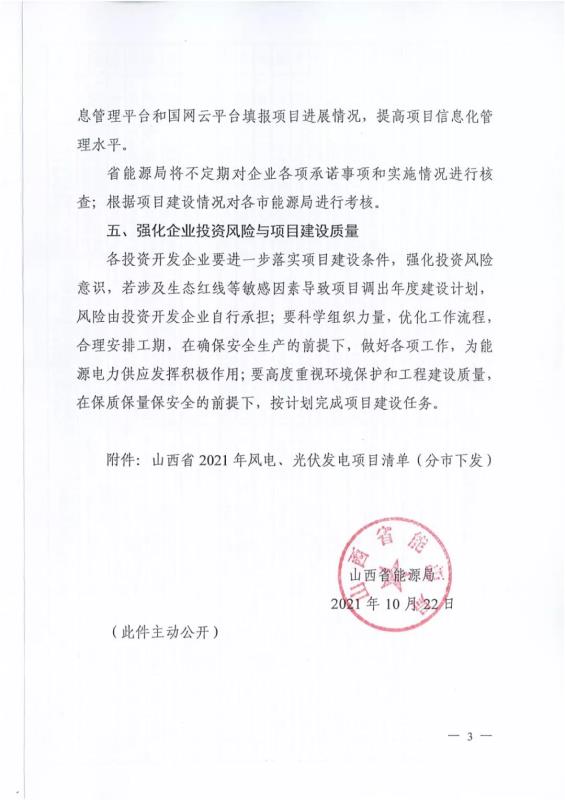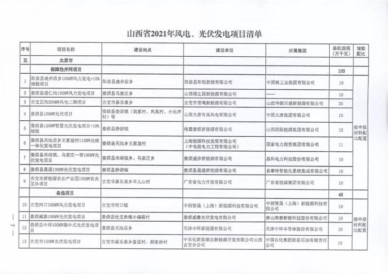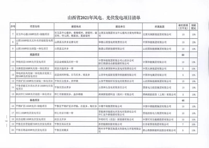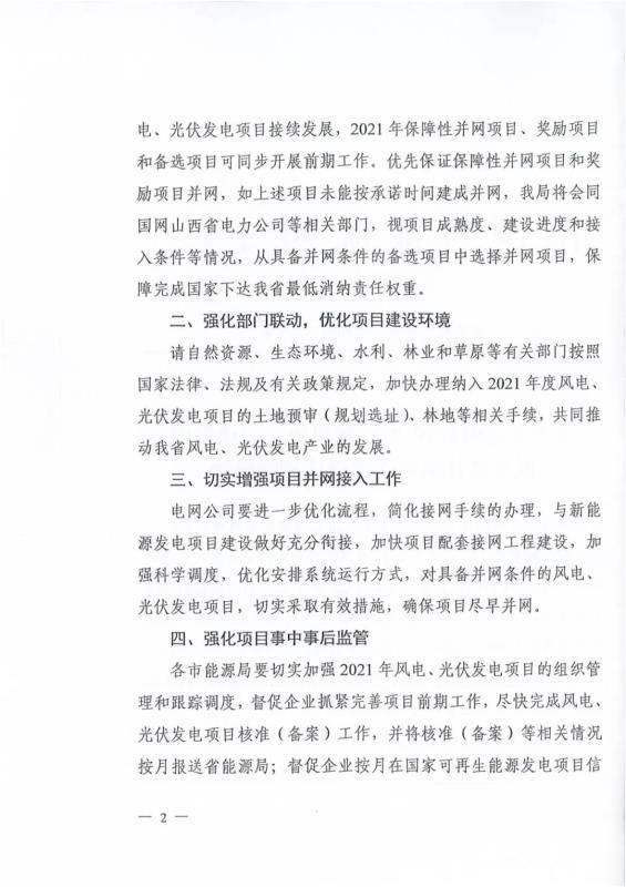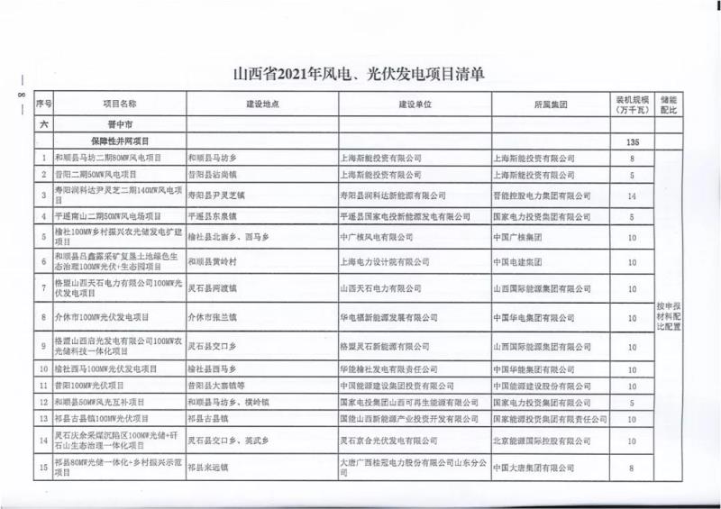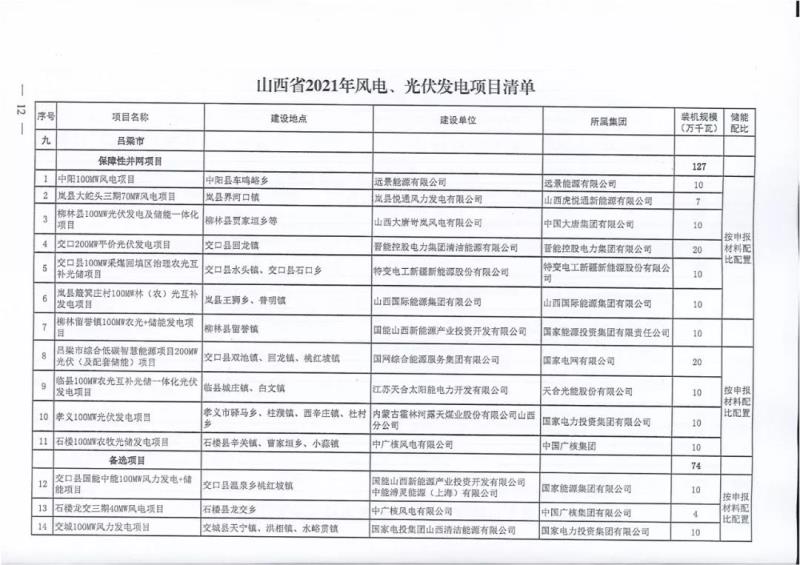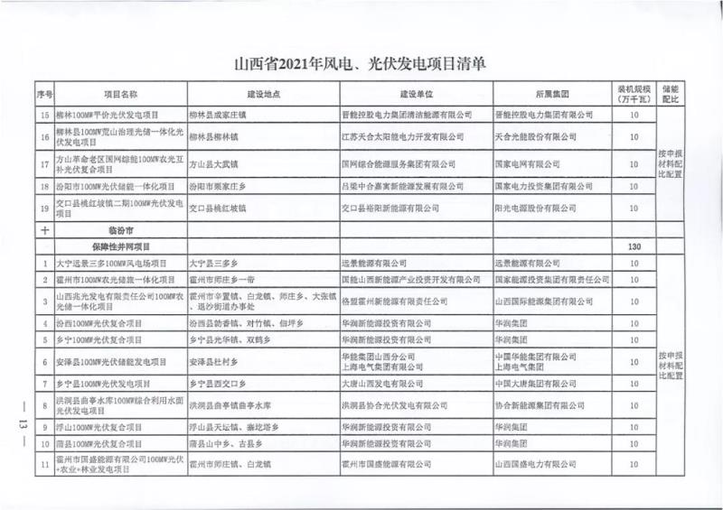 中國儲能網(wǎng)訊:10月22日,山西正式2021年度風(fēng)電、光伏發(fā)電保障性并網(wǎng)年度建設(shè)計劃。風(fēng)、光合計17.792GW,其中保障性11.2GW+獎勵700MW+備選5.892GW(山西下發(fā)9.71GW光伏保障項目(另備選4.95GW),配10%-15%儲能,文件明確保障性規(guī)模與獎勵規(guī)??赏介_展前期工作,優(yōu)先保證保障性并網(wǎng)項目和獎勵項目并網(wǎng),如上述項目未能按承諾時間并網(wǎng),將視項目成熟度、建設(shè)進度和接入條件等,從備選項目中選擇并網(wǎng)項目,保障完成國家下達的最低消納責(zé)任權(quán)重。