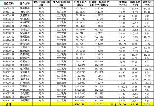 從當(dāng)前統(tǒng)計的27家火力發(fā)電中,平均市盈率(TTM)僅30.5倍,平均毛利率和凈利率分別為12.32%和5.59%;相比之下,風(fēng)力發(fā)電公司的平均市盈率(TTM)為59.2倍,光伏發(fā)電企業(yè)的平均市盈率(TTM)高達(dá)227.9倍,水利發(fā)電的平均市盈率也超過了火力發(fā)電,達(dá)到了63倍;很明顯,當(dāng)前火力發(fā)電由于概念題材和行業(yè)預(yù)期較低,又疊加了煤炭價格上漲擠壓電廠利潤,導(dǎo)致了低估值的區(qū)間。中長期來看,火電板塊的利潤改善加新能源轉(zhuǎn)型的企業(yè)大概率將獲得價值重估。