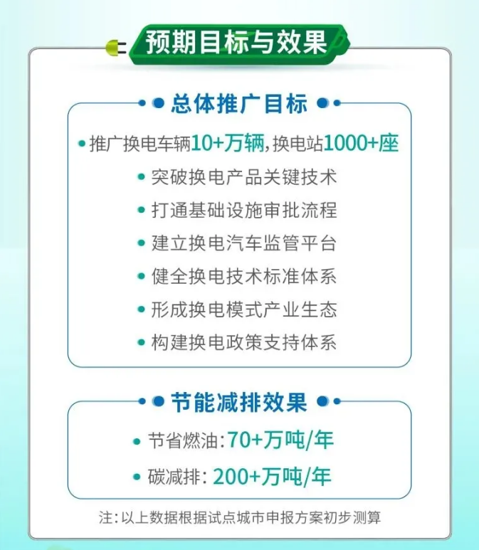 根據(jù)《通知》,本次試點總體推廣目標為推廣換電車輛10+萬輛、換電站1000+座,其中包括突破換點產(chǎn)品關(guān)鍵技術(shù),打通基礎(chǔ)設(shè)施審批流程,建立換電汽車監(jiān)管平臺,健全換電技術(shù)標準體系,形成換電模式產(chǎn)業(yè)生態(tài),構(gòu)建換電政策支持體系。在節(jié)能減排方面,力爭達到節(jié)省燃油70+萬噸/年、碳減排200+萬噸/年。