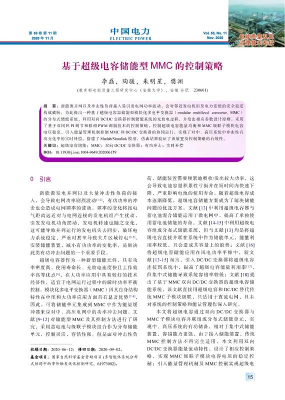 LI Lei, Jun TAO, ZHU Mingxing, et al. Control strategy for mmc based on super-capacitor energy storage[J]. Electric Power, 2020, 53(11): 15-22.