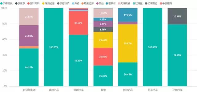 造車新勢力里,蔚來和理想短期內(nèi)沒有選擇寧德時代以外的電池,小鵬給了億緯鋰能21%的份額。零跑是寧德時代+國軒高科兩種組合;合眾選擇寧德時代+捷威和其他電芯;威馬則是由寧德時代+瑞浦+塔菲爾三家來分需求。