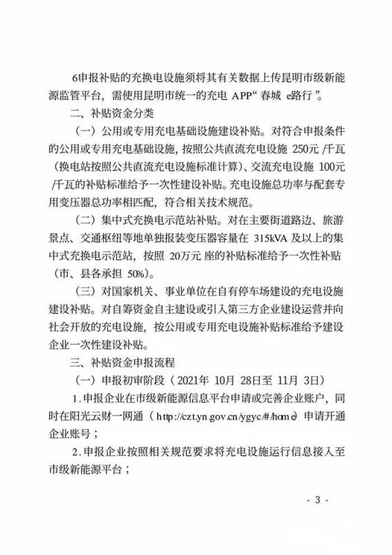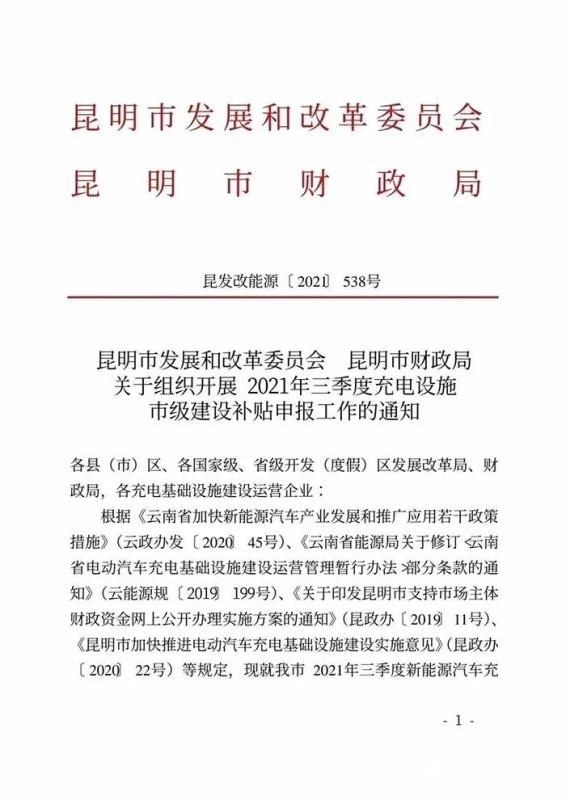 近日,昆明市發(fā)展和改革委員會、昆明市財政局發(fā)布《關于組織開展2021年三季度充電設施市級建設補貼申報工作的通知》(以下簡稱“通知”)。通知指出,昆明市2021年三季度新能源汽車充電設施市級建設補貼申報對象為:1.在昆明市發(fā)展和改革委員會進行過充電基礎設施建設運營登記的企業(yè);2.其他符合申報充電基礎設施獎勵和補貼條件的單位或企業(yè)。