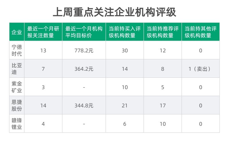 在上周重點關(guān)注的A、H股中新能源汽車上下游產(chǎn)業(yè)鏈市值排名靠前的5家上市公司中,寧德時代10月以來獲得13份券商研報關(guān)注,平均目標價為778.20元/股。而比亞迪(002594.SZ)則獲得7份券商研報關(guān)注,其中3家給出了目標價,平均為364.2元/股。