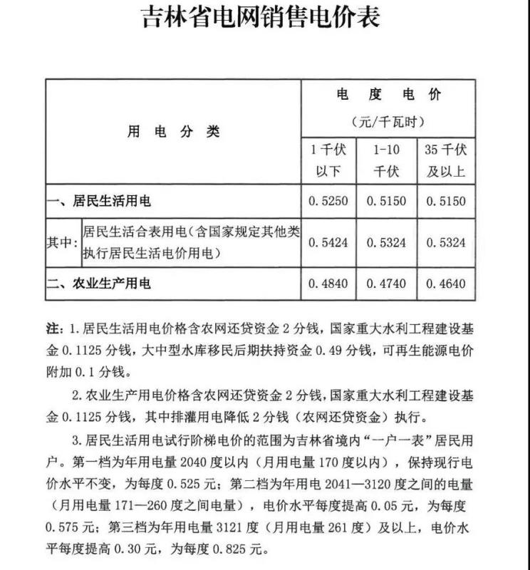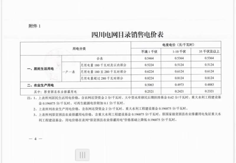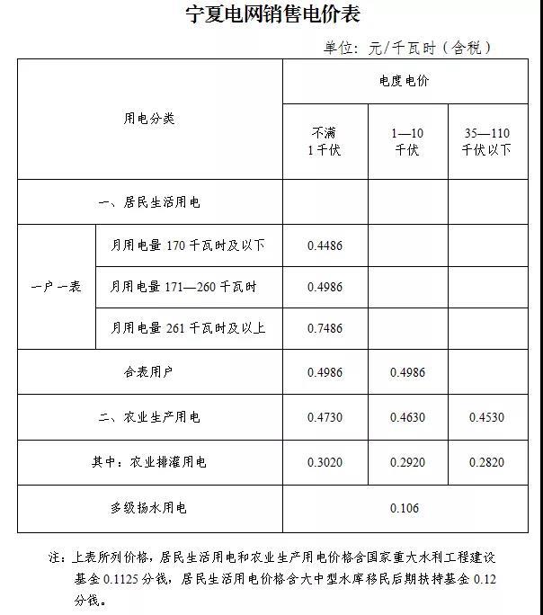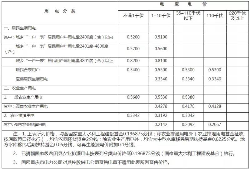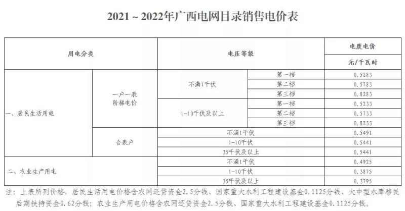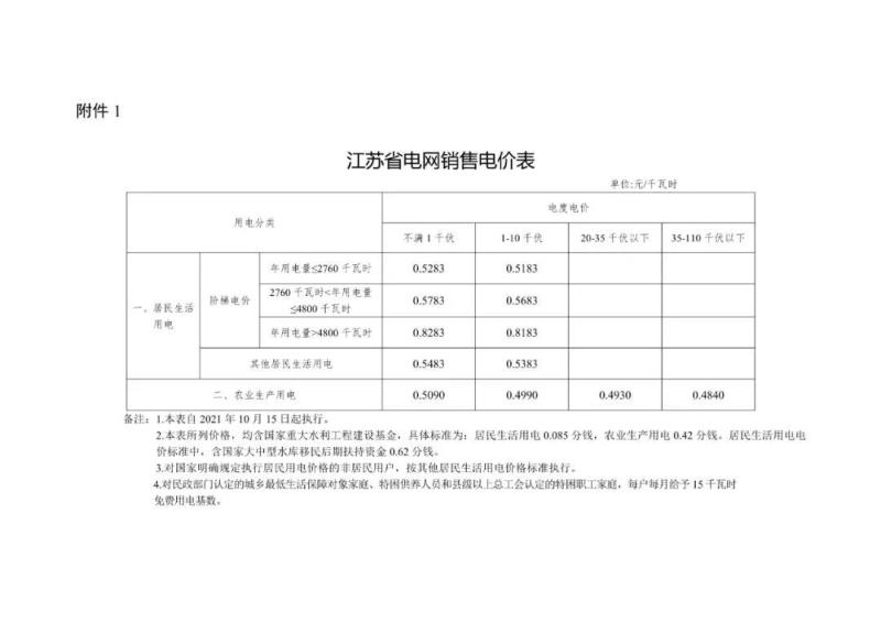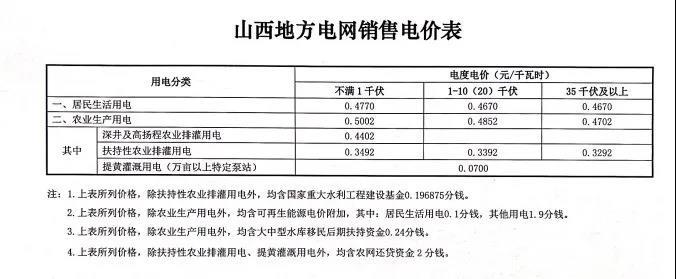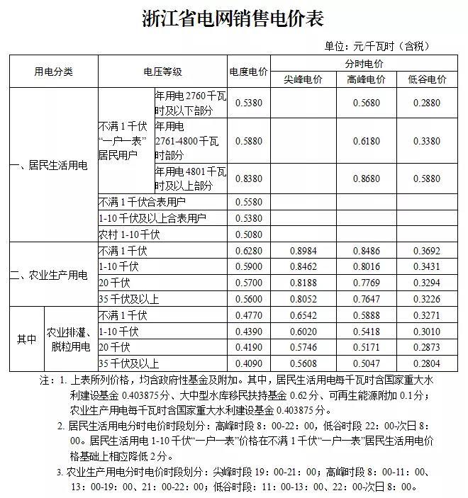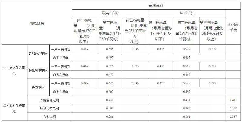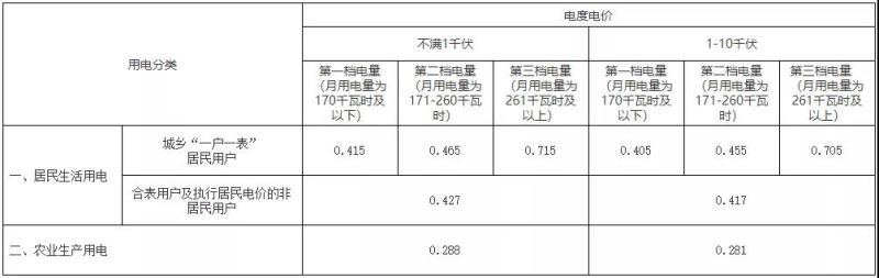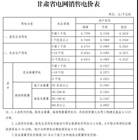 注:1.上表所列價(jià)格,均含國(guó)家重大水利工程建設(shè)基金0.1125分錢。2.上表所列價(jià)格,除農(nóng)業(yè)生產(chǎn)用電外,均含大中型水庫(kù)移民后期扶持資金0.23分錢、可再生能源電價(jià)附加0.1分錢。3.對(duì)城鄉(xiāng)“低保戶”和農(nóng)村牧區(qū)“五保戶”家庭每戶每月設(shè)置15度免費(fèi)用電基數(shù),分別按照表中居民生活用電第一檔電量電價(jià)標(biāo)準(zhǔn)收取及返還。4.對(duì)執(zhí)行居民生活用電、農(nóng)業(yè)生產(chǎn)用電的電壓等級(jí)在35-110千伏及以上的用戶,按表中1-10千伏所對(duì)應(yīng)的電度電價(jià)標(biāo)準(zhǔn)執(zhí)行。