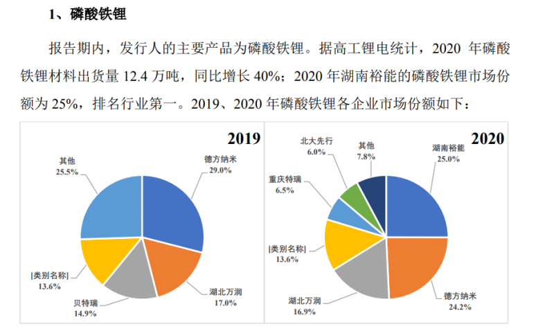 根據(jù)湖南裕能招股書(申報(bào)稿,下同)顯示,公司2020年在國內(nèi)磷酸鐵鋰正極材料領(lǐng)域的市場(chǎng)占有率為25%,磷酸鐵鋰出貨量排名第一。按出貨量計(jì)算,湖南裕能實(shí)為磷酸鐵鋰“一哥”。