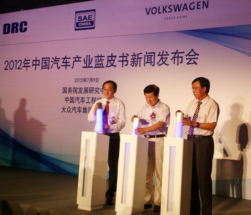 原國務(wù)院發(fā)展研究中心副主任魯志強,中國汽車工程學(xué)會副秘書長張進(jìn)華,國務(wù)院發(fā)展研究中心產(chǎn)業(yè)經(jīng)濟(jì)研究部部長馮飛,中國汽車工程學(xué)會副秘書長兼汽車產(chǎn)業(yè)研究院執(zhí)行院長張寧,國務(wù)院發(fā)展研究中心產(chǎn)業(yè)經(jīng)濟(jì)研究部副部長石耀東,大眾汽車集團(tuán)(中國)執(zhí)行副總裁張綏新等三方領(lǐng)導(dǎo)共同出席并見證了2012年中國汽車產(chǎn)業(yè)藍(lán)皮書的問世。