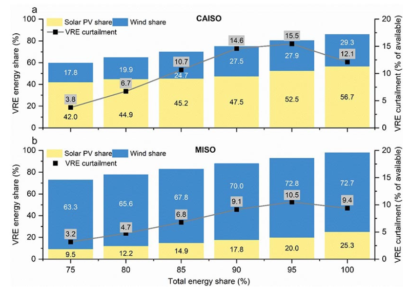 隨著CAISO(圖上方)和MISO(圖下方)的電力系統(tǒng)采用的可再生能源滲透率接近100%,可再生能源的限電行為開始減少,因為季節(jié)性儲能系統(tǒng)變得具有成本效益,并增加了電力系統(tǒng)的儲能容量。